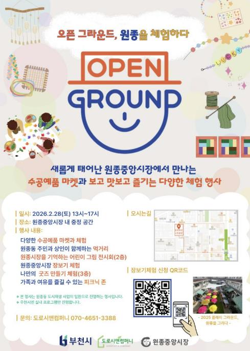 [뉴스앤톡] 부천시는 2월 28일 오정구 원종동에 소재한 원종중앙시장(부천시 오정구 성오로124번길 47)에서 변화된 시장 공간을 시민이 직접 체험하는 ‘오픈 그라운드, 원종을 체험하다’ 행사를 연다.