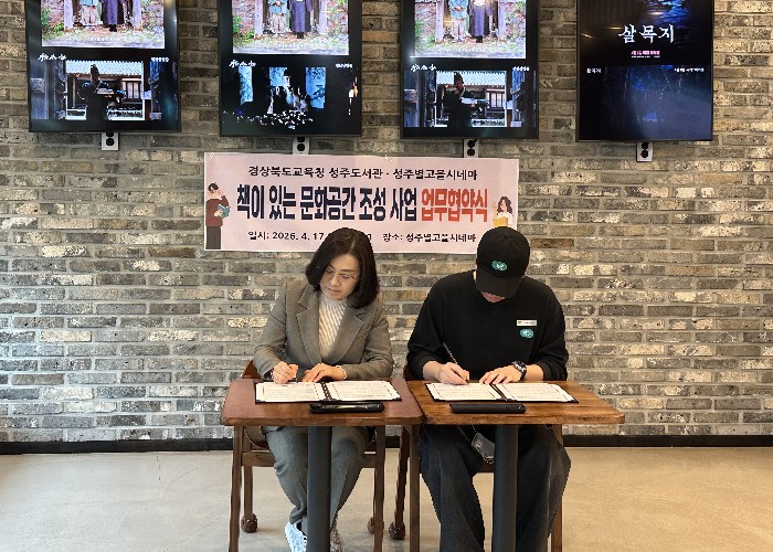 [뉴스앤톡] 경상북도교육청 성주도서관은 성주별고을시네마와 '책이 있는 문화공간 조성'사업 추진을 위한 업무협약을 체결하고, 작은영화관과 연계한 독서문화 확산에 나선다.