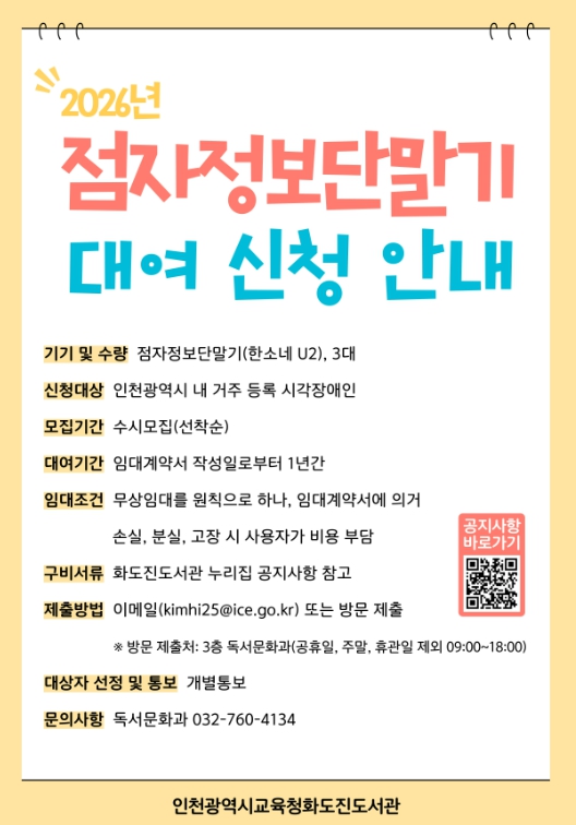 [뉴스앤톡] 인천광역시교육청화도진도서관은 인천 거주 시각장애인을 대상으로 ‘점자정보단말기 무상대여 사업’을 운영한다고 9일 밝혔다.