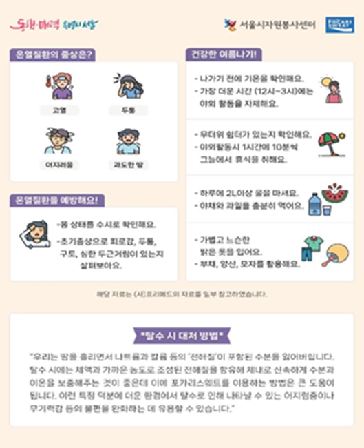 서울시자원봉사센터는 폭염 예방을 위해 휴대용 쿨타월, 쿨토시, 포카리스웨트 분말 가루, 편지가 작성된 폭염 예방 안내문 엽서를 보냉백에 담아 자원봉사자에게 활동 키트로 제공하며, 자원봉사자 1,000여 명이 폐지 수집 어르신에게 직접 전달과 함께 안부 묻기 활동을 진행할 예정이다.