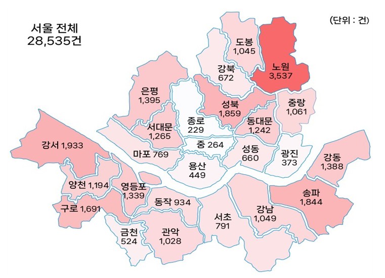 지난해 10월 서울 전역 토지거래허가제 시행 이후 올해 3월 말까지 누적 신청건수는 총 28,535건, 이 중 24,669건(86.5%)이 처리된 것으로 나타났다.