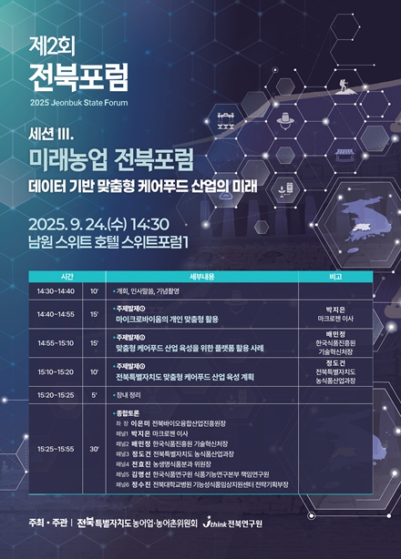 [뉴스앤톡] 전북특별자치도는 오는 24일 남원 스위트호텔에서 '데이터 기반 맞춤형 케어푸드 산업의 미래'를 주제로 '미래농업 전북포럼'을 연다고 22일 밝혔다.