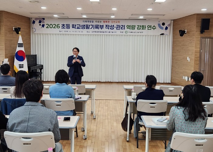 [뉴스앤톡] 경상북도김천교육지원청은 2026년 4월 15일(수) 김천학생문화예술센터에서 관내 초등학교 학교생활기록부 업무담당자 및 희망 교사 30명을 대상으로 '2026 초등 학교생활기록부 작성・관리 역량 강화 연수'를 실시했다.