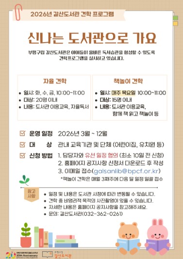 특히 갈산도서관은 5월부터 기존 월 1회 운영하던 ‘책놀이 견학’을 매주 목요일로 확대해 더 많은 기관에 참여 기회를 제공할 계획이다.