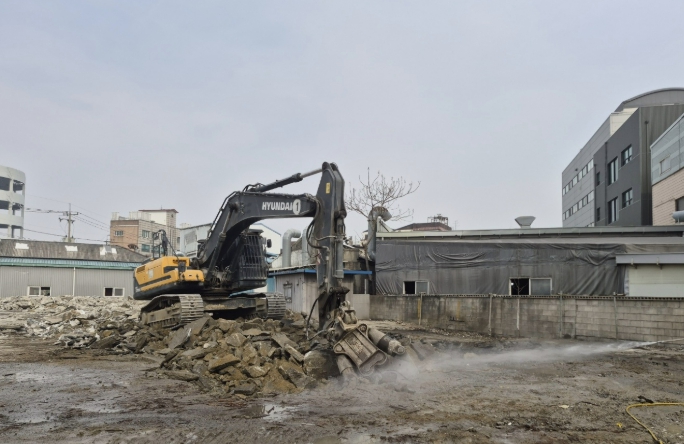 | ▲ 공사장에서 살수 작업을 통해 비산먼지 발생을 저감하고 있다. |