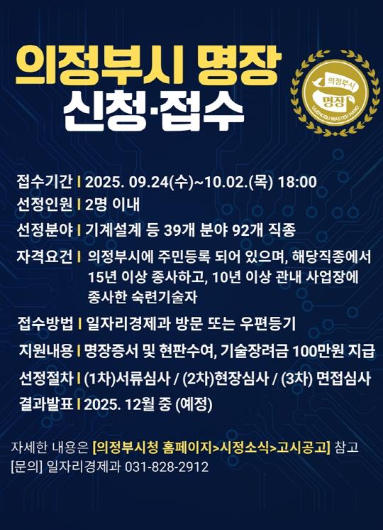 [뉴스앤톡] 의정부시는 우수 숙련기술인을 발굴하고 숙련기술 우대 문화를 확산하기 위해 ‘2025년도 의정부시 명장’을 공모해 선정한다.