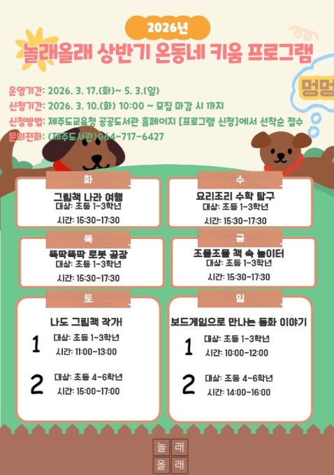 [뉴스앤톡] 제주도교육청 제주도서관은 도내 초등학생들의 알찬 방과 후와 주말 활동을 지원하기 위해 2026년 상반기 주중·주말 온동네 키움 프로그램’을 본격 운영한다.