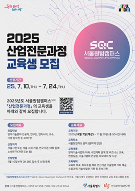 서울시는 한국과학기술연구원(KIST)과 함께 양자과학기술 교육 과정인 서울퀀텀캠퍼스(Seoul Quantum Campus, SQC)의 ‘산업전문과정’ 2기 교육생을 7월 10일부터 24일까지 모집한다고 밝혔다.