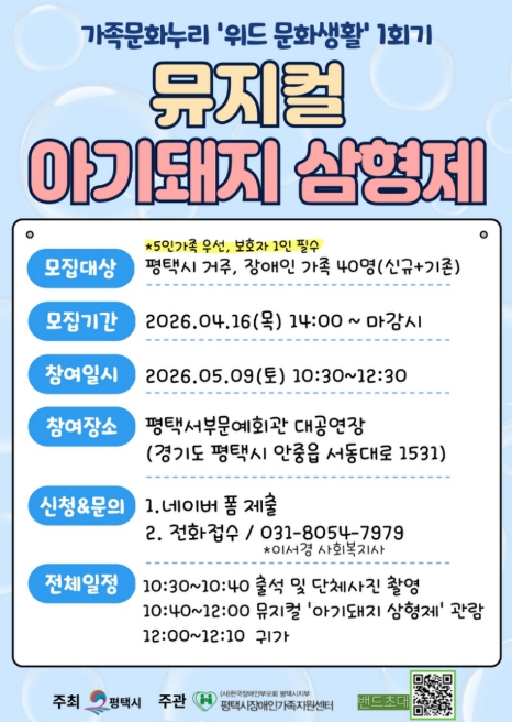 이번 1회기는 오는 5월 9일 오전 10시 30분부터 12시까지 평택서부문예회관에서 진행되며, 가족뮤지컬 ‘아기돼지 삼형제’관람 프로그램으로 운영된다. 공연 관람을 통해 가족 간 상호작용을 촉진하고 긍정적인 정서 경험을 통한 유대감 향상에 기여할 수 있을 것으로 기대된다.