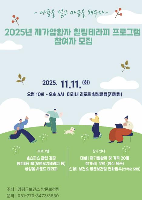 [뉴스앤톡] 양평군은 재가암환자와 그 가족을 대상으로 ‘2025년 재가암환자 힐링테라피 프로그램’ 대상자를 모집한다고 밝혔다. 프로그램은 오는 11월 11일, 양평 미리내 리조트 내 힐빙클럽에서 진행될 예정이며, 총 20명을 모집한다.