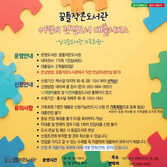 [뉴스앤톡] 대구 남구는 오는 2월 24일 화요일 10시부터 꿈틀작은도서관에서‘전집대출’ 서비스를 운영한다고 밝혔다.