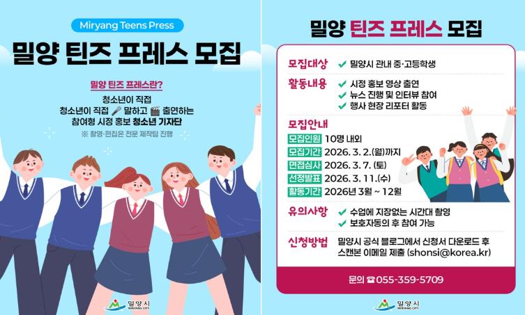 [뉴스앤톡] 경남 밀양시는 청소년이 직접 시정 소식을 전하는 참여형 홍보 프로그램 ‘밀양 틴즈 프레스(Miryang Teens Press)’를 모집한다고 13일 밝혔다.