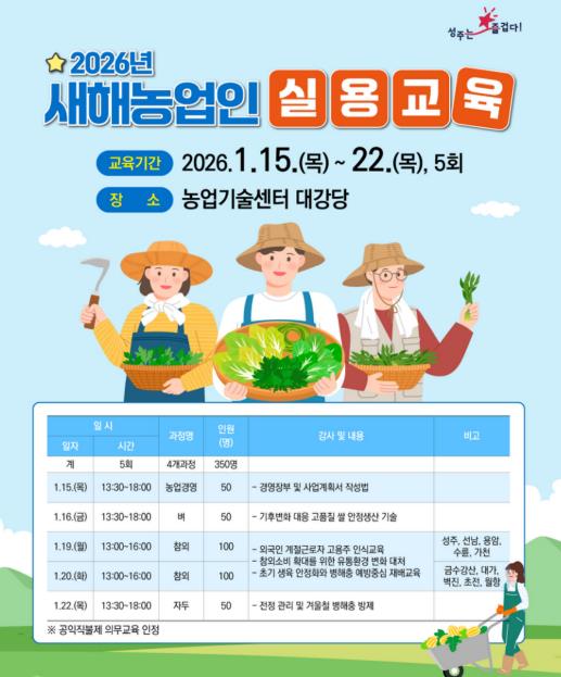 [뉴스앤톡] 성주군은 오는 1월 15일부터 22일까지 농업기술센터 대강당에서 지역 농업인 350여명을 대상으로 '2026년 새해농업인실용교육'을 실시한다.