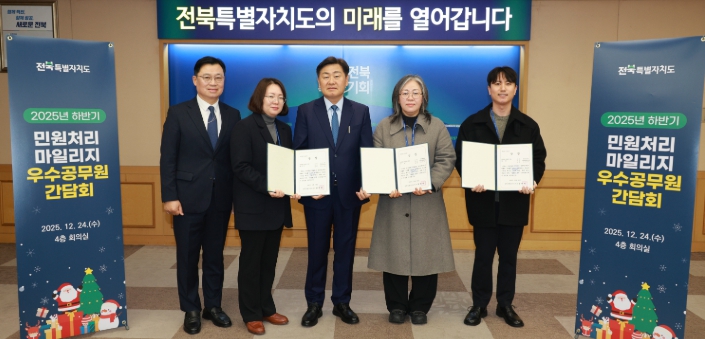 [뉴스앤톡] 전북특별자치도가 24일 '2025년 하반기 민원 처리 우수직원 시상 및 간담회'를 개최하고, 신속하고 성실한 민원 업무 수행으로 높은 평가를 받은 직원들을 격려했다.