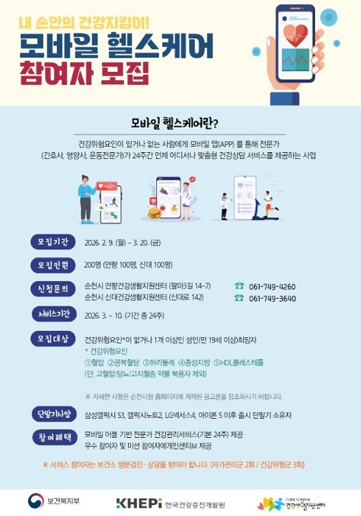 [뉴스앤톡] 순천시는 ICT 기반 공공형 건강관리서비스인 ‘2026년 보건소 모바일 헬스케어 사업’ 참여자를 모집한다고 밝혔다.