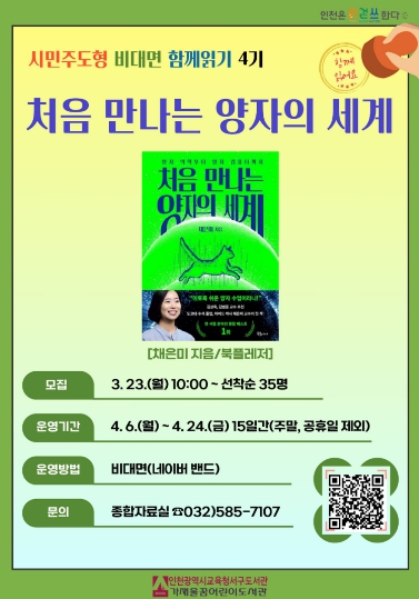 비대면 함께읽기 프로그램은 인천 시민의 추천과 투표로 선정한 도서를 참여자들이 함께 읽는 독서 프로그램으로, 4기 선정 도서는 『처음 만나는 양자의 세계』이며 전문강사의 안내로 어렵고 낯설게 느껴지는 양자의 세계를 보다 쉽게 이해할 수 있도록 진행할 계획이다.
