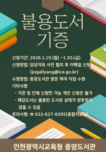 [뉴스앤톡] 인천광역시교육청중앙도서관은 지역사회 내 도서 나눔 문화를 확산하고 지식 자원의 선순환을 실천하기 위해 ‘불용도서 기관 나눔’ 사업을 운영한다.