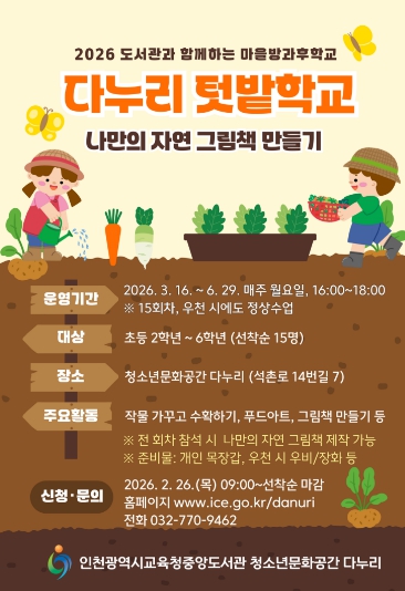 [뉴스앤톡] 인천광역시교육청중앙도서관 청소년문화공간 다누리는 26일부터‘다누리 텃밭학교: 씨앗에서 그림책까지’ 참여자를 모집한다.