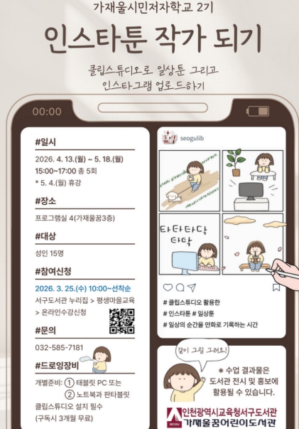 [뉴스앤톡] 인천광역시교육청서구도서관은 지역 주민의 창작 활동을 지원하기 위해, 25일부터 가재울 시민저자학교 2기 프로그램인 ‘인스타툰 작가되기’ 참여자를 모집한다.