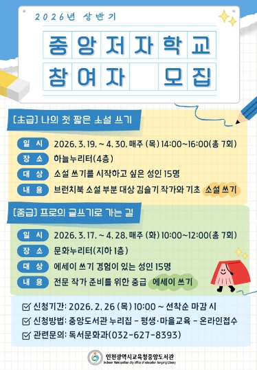 [뉴스앤톡] 인천광역시교육청중앙도서관은 26일부터 시민의 글쓰기 역량 강화를 위한 상반기 ‘중앙저자학교’ 프로그램 참여자를 모집한다.