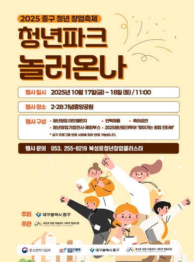 [뉴스앤톡] 대구 중구는 청년창업가와 지역 주민이 함께 어울릴 수 있는 교류의 장을 마련하고자 2025년 중구 청년창업 축제 '청년파크 : 놀러온나'를 오는 10월 17일부터 18일까지 양일간 2·28기념중앙공원에서 개최한다고 밝혔다.