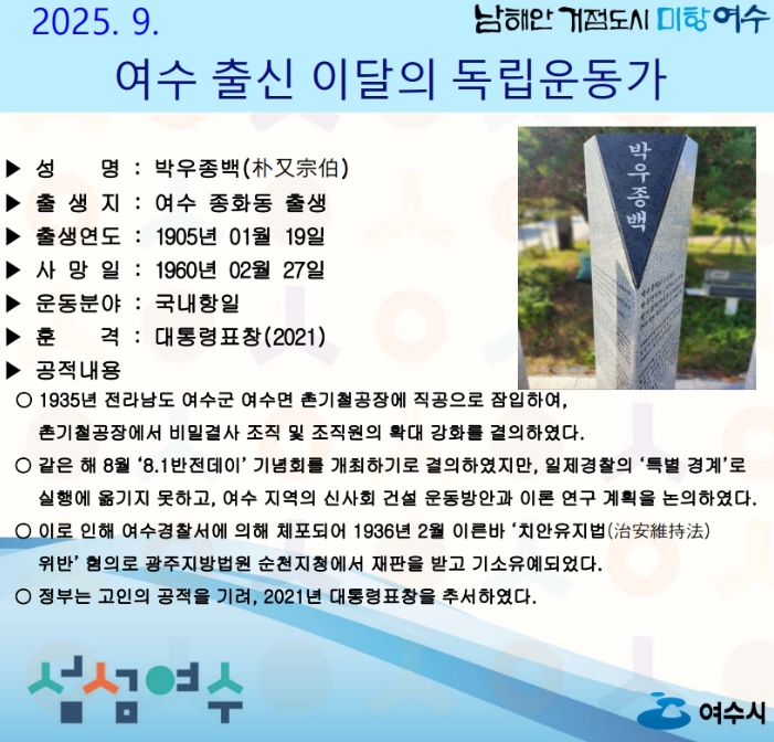 여수시, 2025년 9월의 독립운동가에 ‘박우종백’ 선생 선정