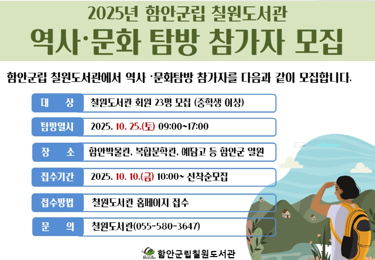 [뉴스앤톡] 함안군립 칠원도서관이 '2025년 하반기 역사·문화탐방' 프로그램 참가자를 모집한다.