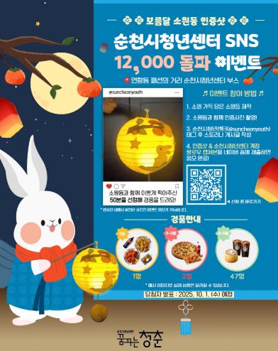 [뉴스앤톡] 순천시 청년센터는 공식 SNS 가입자가 1만 2천 명을 돌파함에 따라 청년과 시민들의 성원에 보답하기 위해 기념 이벤트를 진행한다고 밝혔다.