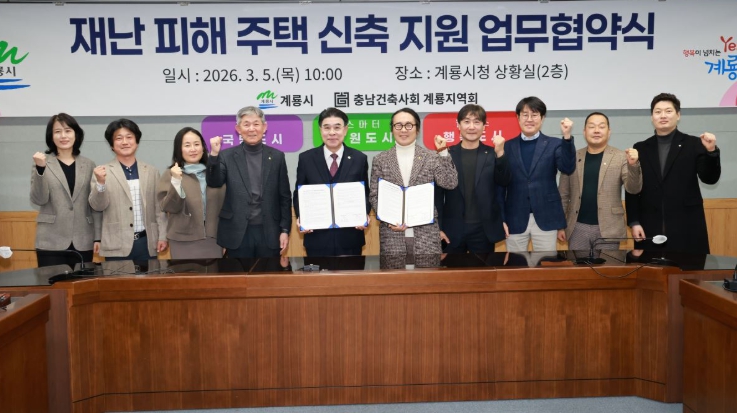 [뉴스앤톡] 충남 계룡시는 5일 시청 상황실에서 충남건축사회 계룡지역회(회장 류욱형)와 ‘재난 피해 주택 신축지원을 위한 업무협약’을 체결했다고 밝혔다.