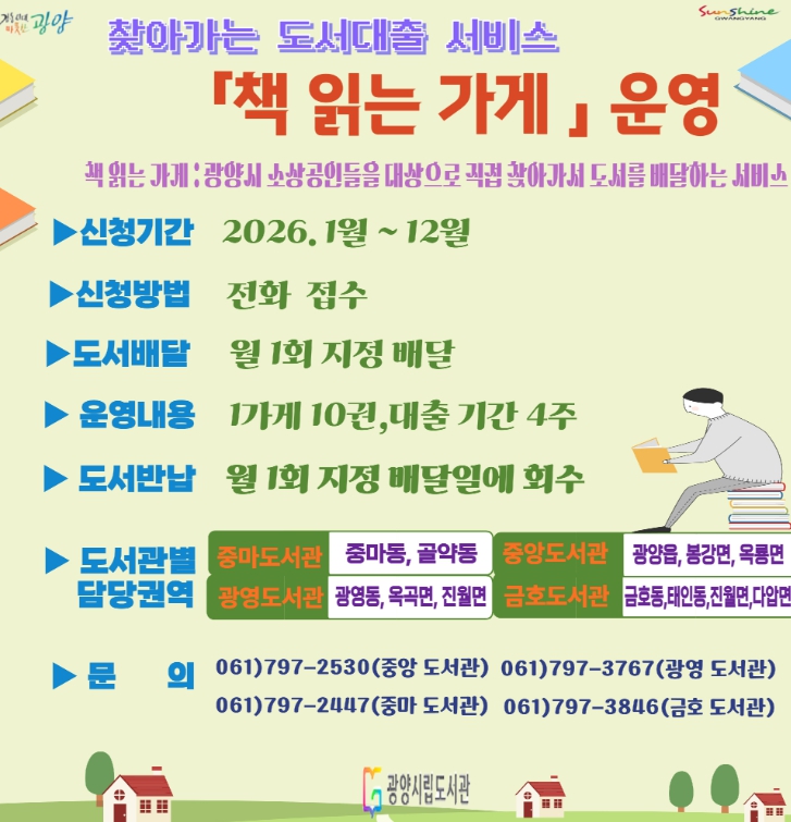 [뉴스앤톡] 광양시립도서관은 지역사회 독서문화 확산을 위해 도서관 방문이 어려운 지역 내 소상공인을 대상으로 2026년 ‘책 읽는 가게’ 사업을 운영한다.