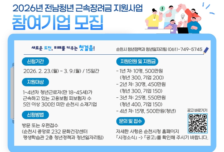 [뉴스앤톡] 순천시는 지역 청년들의 정규직 취업 촉진 및 장기근속을 유도하기 위해 2026년 전남 청년 근속장려금 지원사업 참여 기업을 모집한다고 밝혔다.