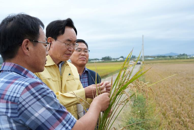 ▲ 나주시가 벼 깨씨무늬병 피해를 본 농가에 복구비를 지원한다. 사진은 윤병태 시장(가운데)이 벼 깨씨무늬병 상태를 살피고 있는 모습.
