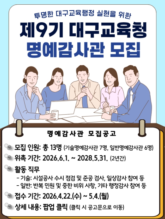 [뉴스앤톡] 대구시교육청은 시민 참여를 통해 감사의 공정성과 투명성을 높이기 위해 ‘제9기 명예감사관’ 13명을 공개 모집한다고 밝혔다.