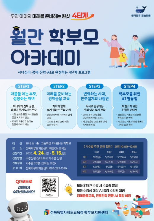 구체적으로는 △1단계 마음을 여는 부모, 성장하는 자녀 △2단계 미래를 준비하는 경제금융 교육 △3단계 변화하는 시대, 진로설계의 나침반 △4단계 학부모를 위한 인공지능(AI) 활용법을 주제로 진행한다.