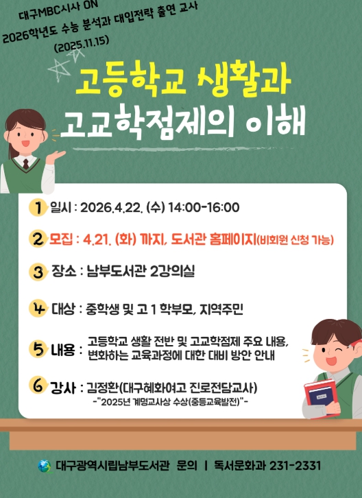 [뉴스앤톡] 대구시교육청 산하 남부도서관은 중학생 및 고등학교 1학년 학부모를 대상으로 고등학교 생활 전반과 고교학점제에 대한 이해를 돕기 위해 '고등학교 생활과 고교학점제의 이해' 특강을 오는 4월 22일 오후 2시부터 4시까지 운영한다.
