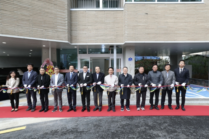 | ▲ ‘구립가재울데이케어센터’ 준공식에서 이성헌 서대문구청장(오른쪽 여섯 번째) 등 참석자들이 기념 테이프를 자르고 있다. |