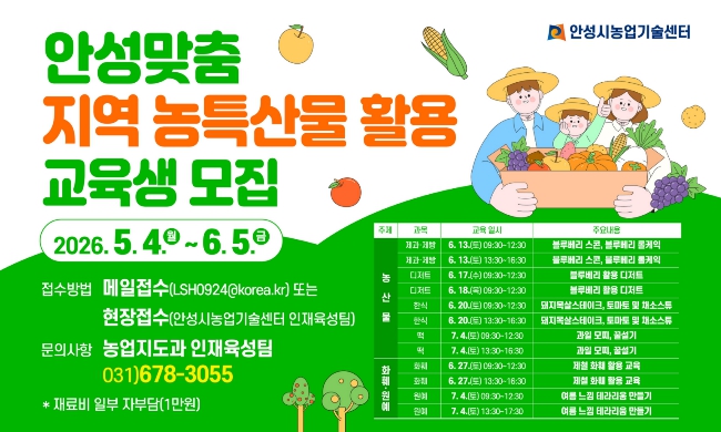 | ▲ 안성시농업기술센터, 안성 농산물 활용 실습 교육생 모집 |