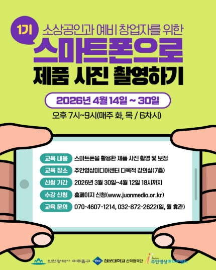 [뉴스앤톡] 인천 미추홀구 주안영상미디어센터(센터장 장구보)는 지역 소상공인과 예비 창업자의 온라인 마케팅 경쟁력을 높이기 위해 ‘스마트폰으로 제품 사진 촬영하기’ 1기 교육 수강생을 모집한다고 밝혔다.