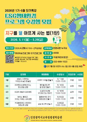 [뉴스앤톡] 인천광역시교육청평생학습관은 4월 29일부터 인천시민을 대상으로 '지구를 덜 아프게 사는 법' ESG 생태환경 프로그램 1기 수강생을 모집한다.