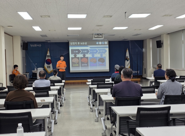 교육은 보은소방서 민경현 소방장의 지도로 진행됐으며 ▲심폐소생술의 원리와 절차 ▲자동심장충격기(AED) 사용법 ▲기도폐쇄 응급처치 방법 등을 중심으로 실습 위주로 운영됐다. 참여자들은 마네킹을 활용한 반복 훈련을 통해 위기 상황에서의 대응 자신감을 높이는 시간을 가졌다.