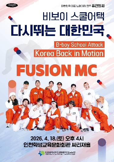 [뉴스앤톡] 인천광역시교육청학생교육문화회관은 오는 18일 대공연장 싸리재홀에서 ‘퓨전엠씨 비보이 스쿨어택 다시 뛰는 대한민국’ 공연을 개최한다.
