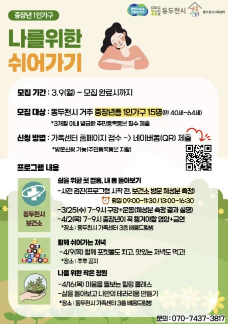“1인 가구 건강 돌봄 – 나를 위한 쉬어가기”는 경기도와 동두천시의 지원을 받아 추진되는 2026년 동두천시 1인 가구 지원사업의 일환으로, 3월 중장년층 프로그램을 시작으로 4월 청년층, 5월 노년층 프로그램이 순차적으로 운영된다. 또한, 5~6월에는 단회기 프로그램도 진행될 예정이다.