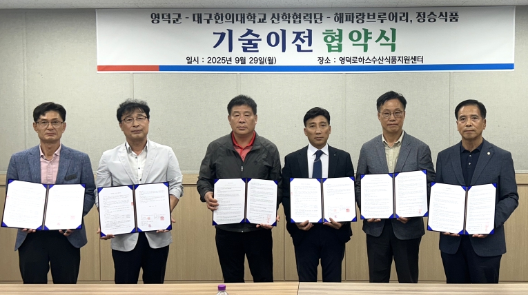 [뉴스앤톡] 영덕군과 로하스수산식품지원센터를 위탁 운영하는 대구한의대학교 산학협력단, 그리고 관내 농산물법인 해파랑브루어리와 수산물업체 정승식품이 지난 29일 산·학·연·관 간 기술이전 협약을 체결했다.