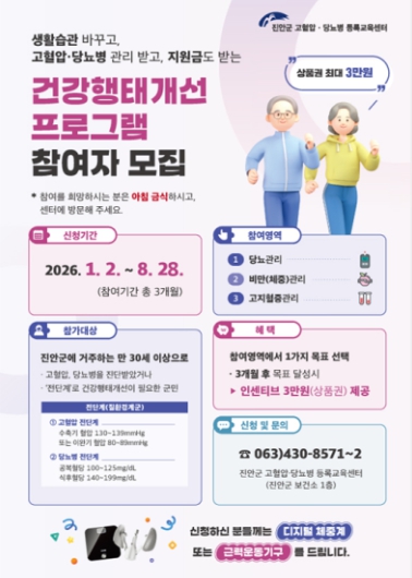 [뉴스앤톡] 진안군 고혈압·당뇨병 등록교육센터가 고혈압·당뇨병이 있는 주민들의 자가 관리능력을 높이고, 건강한 생활 습관 형성을 돕기 위한 '건강행태개선 프로그램'참여자를 모집한다.