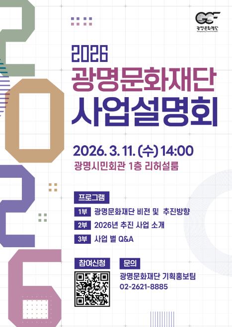 이번 설명회는 광명문화재단의 2026년 비전 및 추진 방향을 시작으로 지역(생활) 문화, 공연·전시, 문화예술교육 및 지원, 문학 사업 소개와 참가자 질의응답 순서로 진행된다. 특히 재단에서 진행하는 공모사업을 ‘2026 광명문화재단 문화예술지원 사업 통합공모’로 묶어 소개하여 각 프로그램의 주요 내용, 운영 일정, 신청 방법 등 정보를 자세하고 정확하게 접할 수 있다.
