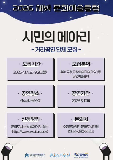 [뉴스앤톡] 수원문화재단은 지역 공연예술의 활성화와 수원시민의 주체적 문화예술 참여를 위해 ‘새빛 문화예술클럽 '시민의 메아리'’ 사업에 참여할 생활예술단체를 모집한다.