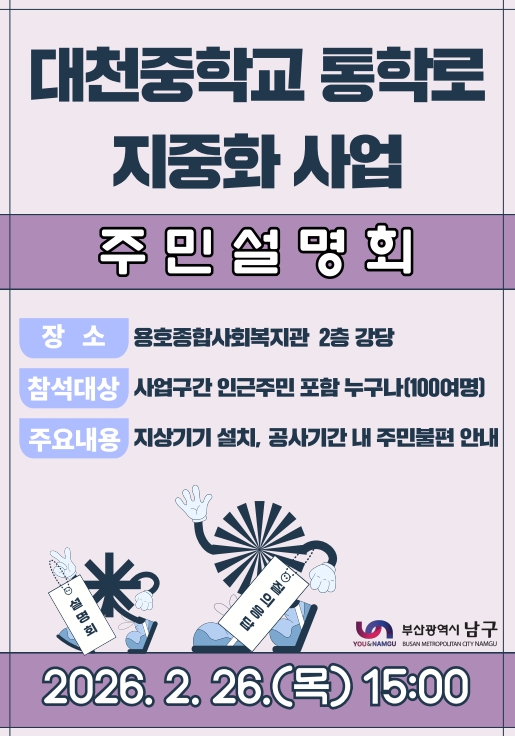 [뉴스앤톡] 부산 남구는 '대천중학교 통학로 지중화사업'과 관련해 오는 2월 26일 오후 3시, 용호종합사회복지관 2층 강당에서 1차 주민설명회를 개최한다.