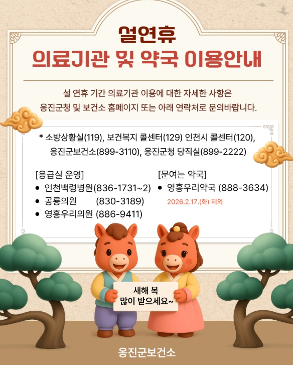 아울러, 주민들이 연휴 기간 중 운영 의료기관을 쉽게 확인할 수 있도록 120·129·119 콜센터 안내, 옹진군 홈페이지 및 응급의료포털 게시 등을 통해 적극 홍보할 예정이다.