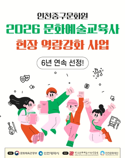 [뉴스앤톡] 인천중구문화원(원장 박봉주)이 문화체육관광부와 인천광역시가 주최하고, 인천문화재단 인천문화예술교육지원센터와 한국문화예술교육진흥원이 주관하는 '2026 문화예술교육사 현장 역량강화 사업(인천)'에 6년 연속 선정되는 쾌거를 달성했다.