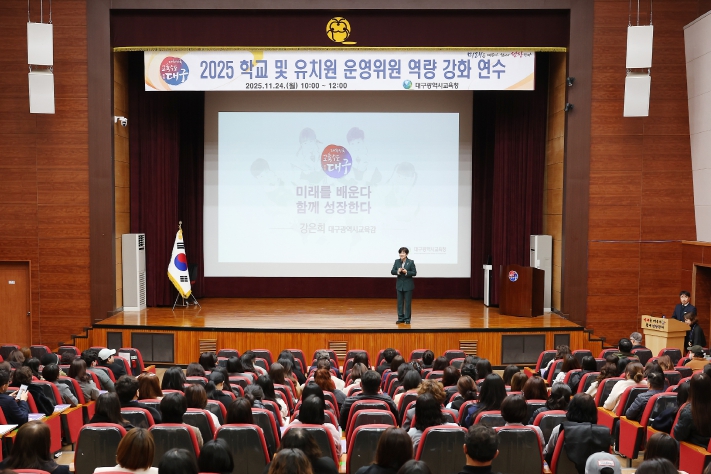 연수는 대구미래교육역량에 대한 강은희 교육감의 강의와 학교운영위원의 역할에 대한 전문가 강의를 통해 각 학교의 실정과 특색에 맞는 창의적인 교육 기반의 토대를 다지고, 학교운영위원의 전문성을 높이고자 마련됐다.